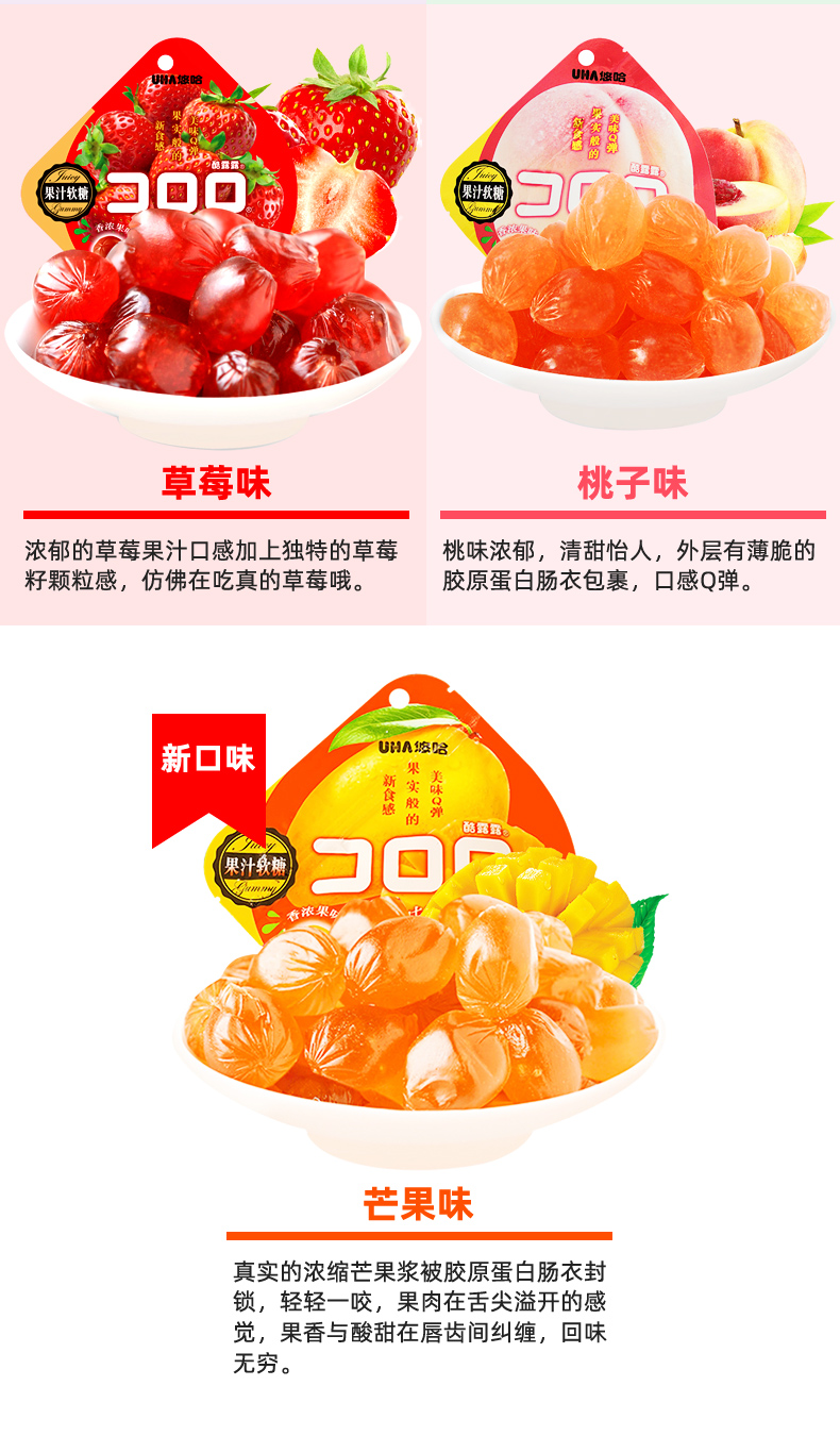 UHA/悠哈桃子味果汁软糖52g/袋 网红爆浆果汁橡皮糖精选凑单果冻